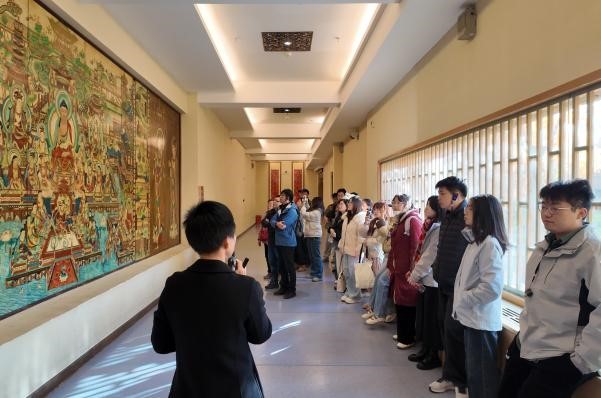 在游览特窟的过程中,师生们惊叹于隋代飞天衣带当风的飘逸、北周本生故事画的朴拙雄浑、西夏的青绿山水以及供养人画像的异域风情。那些被时光打磨的彩塑与经变画,见证着古敦煌作为文化传播重要节点的辉煌,在斑驳的石膏壁上跃动着多元文明交融的生命力。