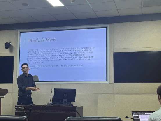 之后,叶老师从多个维度对罗尔斯的现实主义面向进行了解读。叶老师区分了现实主义(realist)和实事求是(realistic)两个概念。现实主义的对立面是关注错误的方向,而实事求是的对立面是理想化和乌托邦主义;而罗尔斯的工作,是提供一个现实主义乌托邦。这个现实主义的乌托邦由于是一个合理的(reasonable)愿景,借助反思平衡,实际上没有完全脱离现实,所以罗尔斯提出的理想并非是一个纯粹假想的乌托邦。然后,叶老师从合法性的优先性、正义、稳定性等维度对罗尔斯的现实主义面向进行了解读。有些人怀疑道德在政治中的独特地位,由此批评罗尔斯的理论。但是,叶老师指出,罗尔斯可能不一定接受这一点,他可能只是在建构政治理论使用了道德因素。