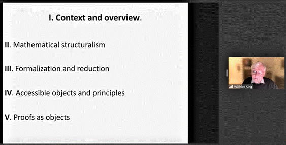 Wilfried Sieg教授继而引入了报告主题的历史背景。希尔伯特和伯奈斯开创了证明论,其是数理逻辑的一个分支。证明论不仅为研究“数学证明”提供了普遍框架,而且也是一种建立具体对象和抽象概念间关联的重要工具。 经典数学和构造性数学间的张力在希尔伯特的有限一致性纲领中得到调和。伯奈斯在他1930年的论文《数学哲学与希尔伯特纲领》中将数学视为理想结构的科学。他的观点强调了19世纪下半叶数学发展的方法论转变。伯奈斯指出刻画这种方法论转变的三个特征:(1)集合论的发展;(2)结构化公理的出现;(3)逻辑与数学间的紧密联系。