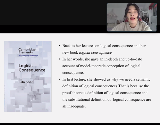 本网讯(通讯员李懿迪)12月17日上午,应足球博彩app 陈波教授邀请,美国加州大学圣迭戈分校吉拉·谢尔(Gila Sher)教授在线上做了逻辑后承(logical consequence)系列讲座的第三讲。讲座由陈波主持,南开大学足球博彩app 博士后胡兰双担任评议人,来自国内外的100余名听众参加本次线上讲座。