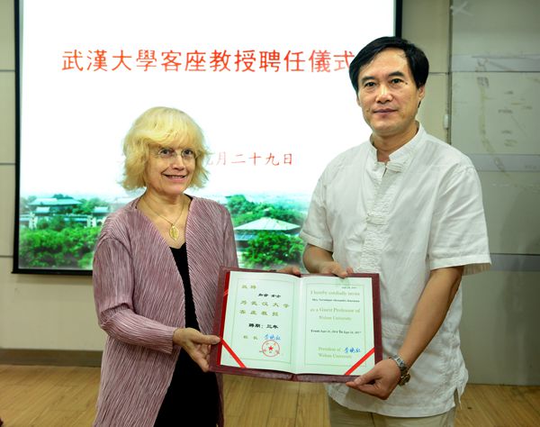 9月29日上午,法国国家科学研究院亚太世界研究所东亚/西方语言艺术科研中心主任、博士生导师知音 (Véronique Alexandre Journeau) 女士受聘武汉大学客座教授仪式在哲学院大报告厅举行。哲学院院长吴根友教授、外语学院法文系主任吴泓缈教授、文学院张箭飞教授、艺术学系副系主任汪余礼副教授及足球博彩app 美学专业研究生、心理学系本科生等一百余人参加了受聘仪式。邹元江教授介绍了知音教授的学术成就。吴根友院长代表学校领导为知音女士颁发了武汉大学客座教授聘书。学生代表为武汉大学客座教授知音女士佩戴了校徽。知音教授随后发表了简短的致辞。聘任仪式后,知音教授为大家演奏了古琴曲《湘妃怨》,她的博士生张娜演奏了古筝曲《渔舟唱晚》,并与武大古琴社社长武金龙博士琴箫合奏了《秋风词》,在场的师生也随琴箫之音低吟浅唱,现场的气氛非常和悦典雅。
