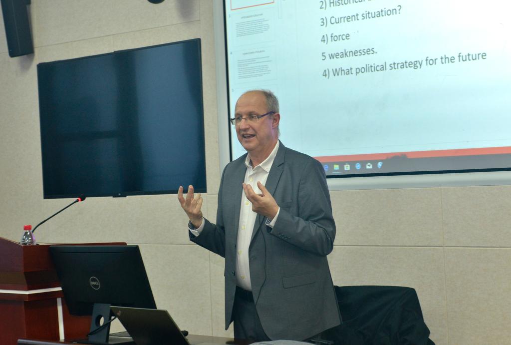 本网讯(通讯员:张萌)2018年11月9日,应足球博彩app-体育博彩平台大全 邀请,比利时法语布鲁塞尔自由大学(ULB)前副校长、政治学与社会学学院院长Jean-Michel DE WAELE教授来足球博彩app 访问交流。晚上19:30,Jean-Michel DE WAELE教授在足球博彩app B214做了题为“当代欧洲激进左派的力量与困难”的讲座。讲座由何萍教授主持,来自足球博彩app 师生共30余人参加了此次讲座。