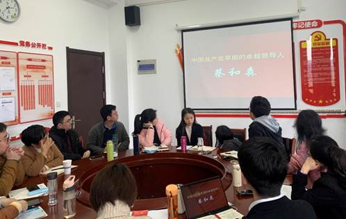 接着,全体成员共同观看了蔡和森和张思德人物事迹短篇,并就党史专题学习交流心得。赵景晨同志分享了一位革命先烈的事迹,被毛泽东称为“坚决革命的同志”—董振堂。宁都起义,为产妇打阻击战,率红5军成为长征中的“铁流后卫”,一个信仰和服从长官的旧军人,成长为以共产主义为信仰的红军高级将领,信仰的力量支撑他到生命的最后一刻。王艺珍分享了一位名叫李林的巾帼,她为掩护机关和群众突围,不顾怀有3个月的身孕,率骑兵连勇猛冲杀,将日伪军引开,自己却被围困。在身负重伤后,仍英勇抗击,毙伤日伪军6人。被日伪军包围后,她宁死不屈,将最后一发子弹射向自己,壮烈牺牲,年仅24岁。詹思群同志分享到,通过党史学习,有两点心得一是信仰,二是传承。中国共产党为什么能?就是因为信仰如磐、精神永志、初心不改。一代人有一代人的使命,一代人有一代人的担当。“红船精神”承载着中国共产党人的初心和使命,具有超越时空的恒久价值和旺盛生命力,站在“两个一百年”的历史交汇点上,年轻一代更应弘扬和传承好“红船精神”。覃俊辉同学分享到,作为青年党员,我们要坚定信仰,处理好个人利益与国家利益的关系,党员和组织的关系。