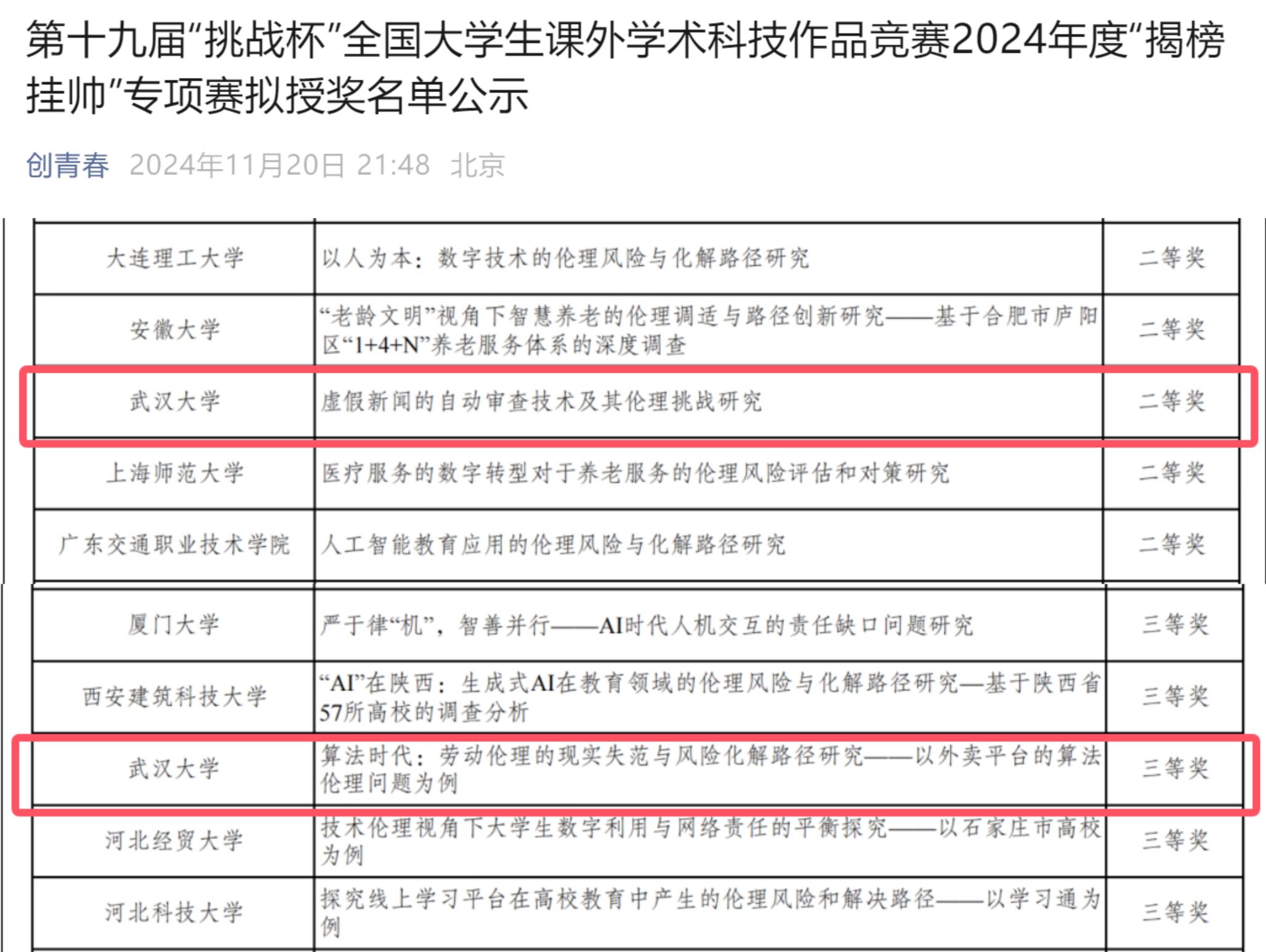 与此同时,陈江进教授参与指导的《算法时代劳动伦理问题研究》项目,通过对外卖平台算法伦理的深入剖析,揭示了算法技术在提升效率的同时对劳动者权益、工作环境及心理健康带来的挑战,并提出了具有前瞻性的风险化解策略,荣获全国三等奖,体现了学院对社会热点问题的敏锐捕捉和深刻思考。