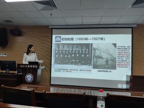 活动首先由秦老师为大家介绍武汉大学自建校以来的校史校情。秦老师的介绍分为四个部分,第一部分题为“百年沧桑”,包含了武汉大学自1893年湖北自强学堂建立以来的百年历史:初创时期就秉承红色基因,为1928年珞珈正式建校奠定良好基础;第一任校长王世杰的宣言为武大牌坊题上了文、法、理、工、农、医六个大字,李四光、叶雅各、开尔斯等人也在此期间为武大做出了卓越贡献;抗战期间,武大西迁乐山办学八年,秉承“学术之上,教育救国”的“乐山精神”,培养出了13位“两院”院士;建国后李达任校长,毛主席访问,查全性院士首倡恢复高考,又为武大校史留下光辉一页。