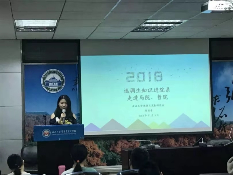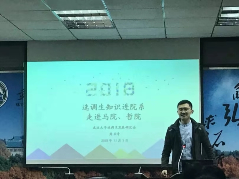 活动伊始,武汉大学选调生发展研究会会长周兵奇从什么是选调生、我国选调生发展历程、各省选调生政策分析和调研地区校友情况等四个方面详细地为同学介绍了一些关于选调的基本知识和最新信息。